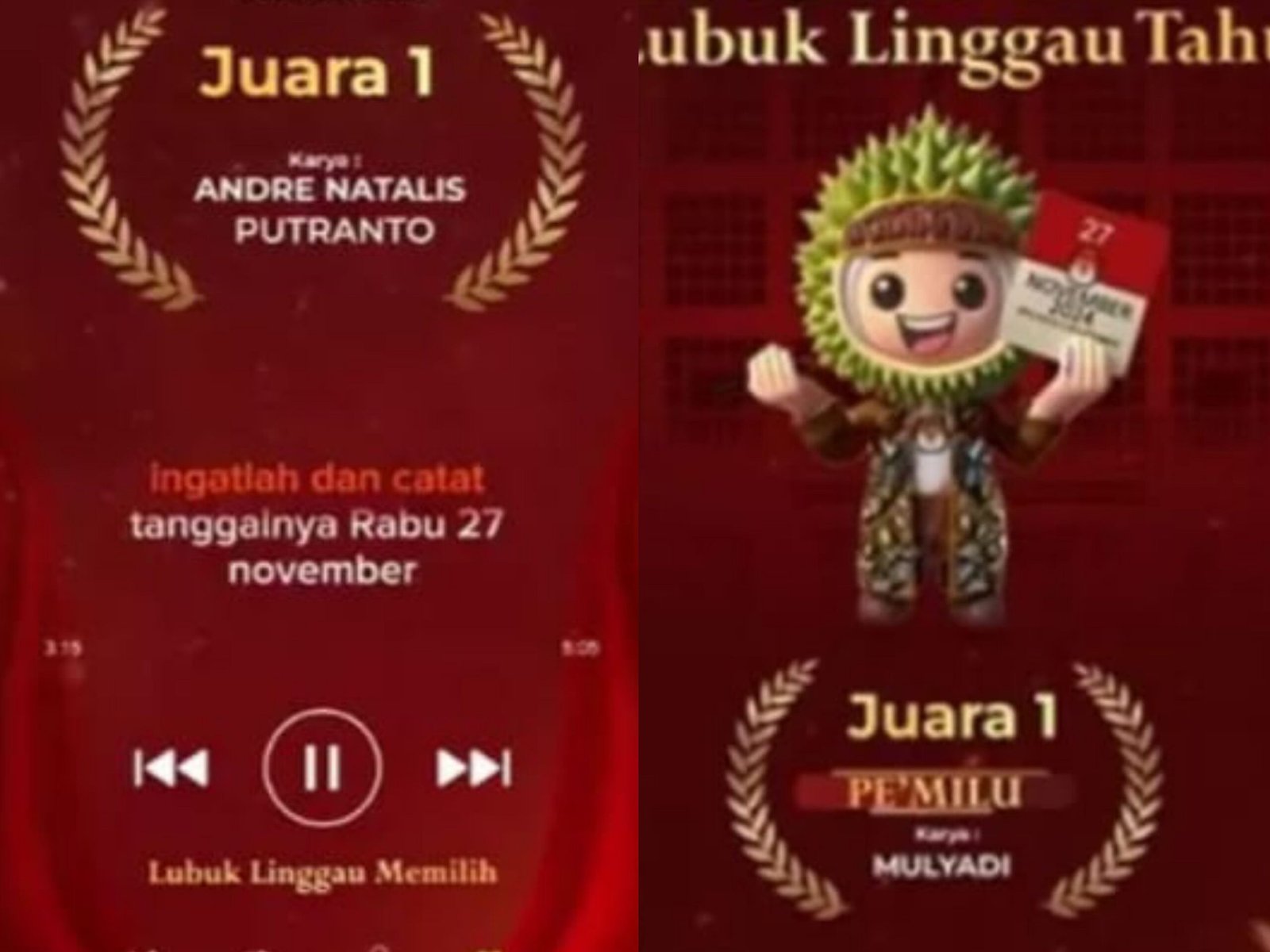 Sedangkan juara ketiga atas nama Diky Faturrahman dengan Karya “Mari Memilih Untuk Lubuklinggau”.
