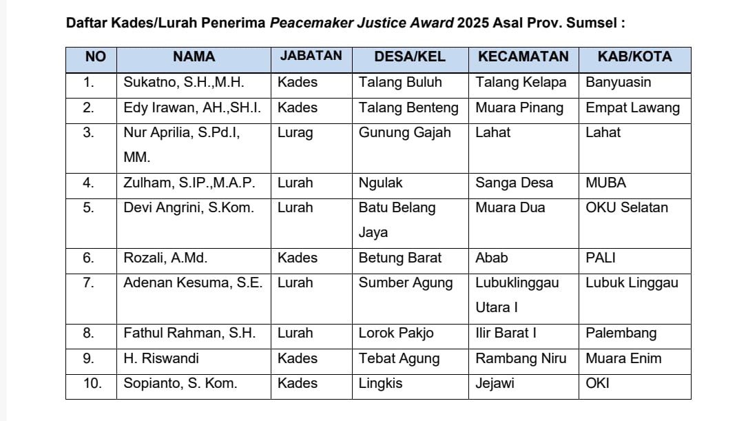 Kemudian dilakukan seleksi lagi dan ditetapkan 130 Kepala Desa dan Lurah terbaik untuk mengikuti kegiatan Peace Maker Justice Award Tahun 2025. Pada kesempatan ini Lurah Sumber Agung Kecamatan Lubuklinggau Utara I Kota Lubuklinggau Provinsi Sumatera Selatan, terpilih sebagai bagian dari 130 Peserta Terbaik di Indonesia, meraih Prestasi Nasional yang diundang untuk menerima Penghargaan dan berhak untuk mendapatkan Piala, Medali dan Piagam.